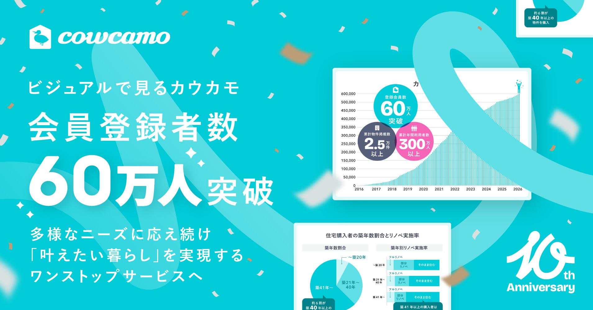 中古・リノベーション住宅の流通プラットフォーム「cowcamo(カウカモ)」は、会員登録者数が60万人を突破 しました。